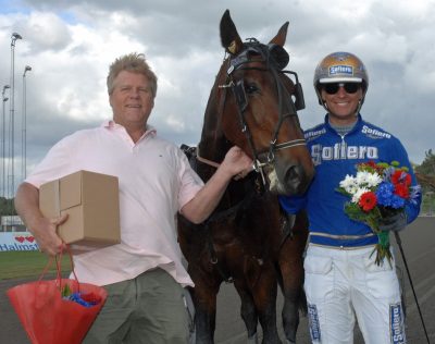 Complete flankeret af ejeren Kaj Holm og kusken Bjรถrn Goop efter sejren – Foto: Halmstadtravet.com
