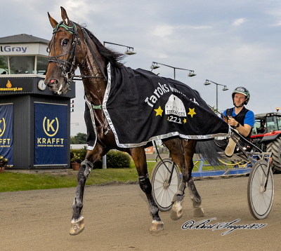 Eros Zola pรฅ รฆreprรฆmie med staldmanden Martin Bjerregaard i sulkyen.