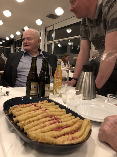 Og så slutter generalforsamlingen i god ro og orden, så vi kan komme til bords og nyde den velkendte menu: Sild og karrysalat, kogt torsk med rødbeder, bacon, peberrod, hakket æg, kartofler og sennepssauce, og så selvfølgelig pandekager med is, præcis som traditionen sig byder.