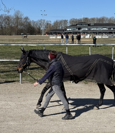 Mig og Axel slentrer nemlig altid en tur på staldterrænet i stedet for at varme op, medmindre det regner eller er koldt, så går vi tur inde i den store forspændingshal, og så bliver Axel spændt for sulkyen lige inden næstsidste løb, hvor han og min niece så traver rundt og gør sig klar til løbet.