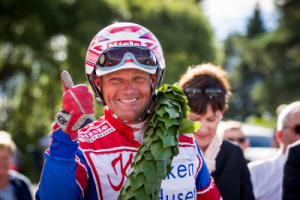 Per Oleg Midtfjeld blev her ramt af en hest kørt af kollegaen Vidar Hop, der testede sin hest modsat løbsretningen