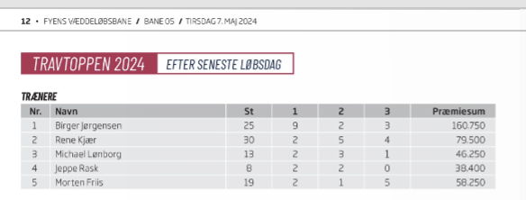 En indtastningsfejl efter et løb den 7. maj på Fyens Væddeløbsbane ændrer stillingen i championatskampen for travtrænere, så ny trænerchampion 2024 på Fyens Væddeløbsbane er Birger Jørgensen.