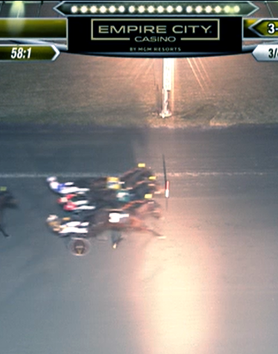 Vinderen i 8. løb på Yonkers Raceway – den 6-årige hoppe, No Mas Drama (Muscles Yankee) med Joe Bongiorno var suveræn.
