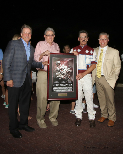 Under løbene fik Campbell overrakt denne poster af den kendte sportskommentator Bruce Beck, Jeff Gural og Jason Settlemoir. Lisa Photo