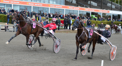 I et spændende opløb får Cuba Libre Ice med Johan Untersteiner overtaget og henviser Confidence med Ken Ecce til andenpladsen i Dansk Trav Kriterium. Foto Kim Gudmand