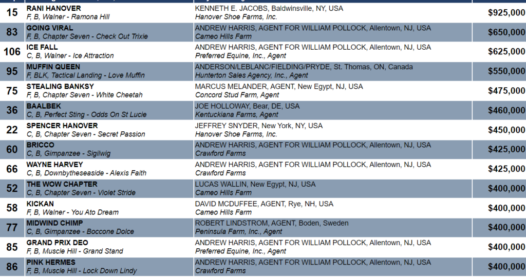 Her er en oversigt over de 14 åringer der solgtes for 400.000 dollars eller mere – de 12 af dem var travere!