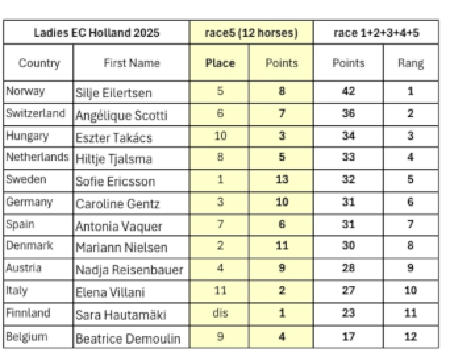Silje Kristin Ejlertsen blev Europamester med 40 points efterfulgt af Angelique Scott, Schweiz med 36 points og Eszter Takacs, Ungarn med 34 points.