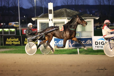 Derbyvinderen Extremes 2-รฅrige helbroder Icebreaker med Jeppe Juel i sulkyen fรฅr i eftermiddag sin debut pรฅ Racing Arena Aalborg.