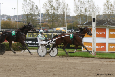 Heller ikke den fik fred i spids, for bagfra kom staldkammeraten Just a Lady med Nicklas Korfitsen i et skud og overtog fรธringen.