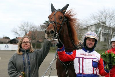 Fire af disse har Mescal sørget for – tre med Steffen Christiansen i sulkyen og nu fik træneren selv også lov til at køre først over stregen med den svenskfødte vallak.