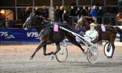 Peter Jensen sender ogsรฅ Wilma Leggrowbach til start pรฅ Klosterskogen med Geir Mikkelsen I sulkyen.