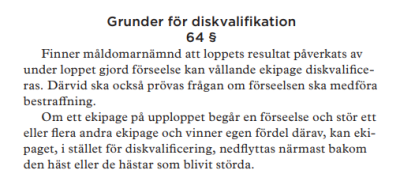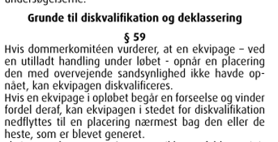 Her stรฅr (oversat): Finder Dommerkomiteen at lรธbets resultat pรฅvirkes af en under lรธbet gjort forseelse, kan den ekvipage, der har generet en anden, diskvalificeres. Desuden skal det ogsรฅ vurderes om der skal idรธmmes en yderligere straf.