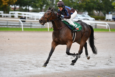 Nancy America med Flemming Jensen vandt sikkert.i fine 1.12.1a/2000 m pรฅ derbydagen Foto Kim Gudmand