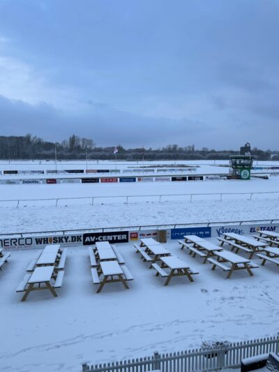 -Nu kom sneen og ligger sig som en let beskyttende dyne hen over banen. Vi har lukket banen for træning i dag, og planen er at ved middagstid vil banepersonalet begynde at rydde banen for sne, så den er helt klar til løbsdagen. Jeg er overbevist om, at vi får en meget fin bane til løbene, siger Claus Juncker.
