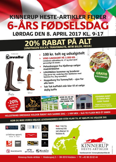 Det er nu seks år siden man startede firmaet Kinnerup hesteartikler og det markeres med et stort gratis kagebord ligesom der er ekstra gode tilbud på en masse varer – også til travsporten, hvor der er op til 20% rabat.