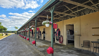 -Frem til slutningen af april træner jeg hestene her på Sunshine Meadows i Florida, hvor vi har en mile bane, lige.-ud bane samt masser af folde – og ikke mindst dejlig solskin og varme.