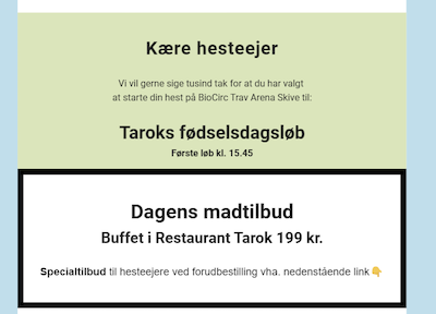 -Det med mails startede i forbindelse med Hesteejerpakken, og er fortsat. Nu udsender vi en mail, nรฅr baneprogrammet er klar med link til sรฅvel program samt startliste og desuden kan hesteejeren bestille buffeten i banens restauration til en nedsat pris โ det er noget vi kan se, at mange benytter sig af, slutter Carsten Terp.